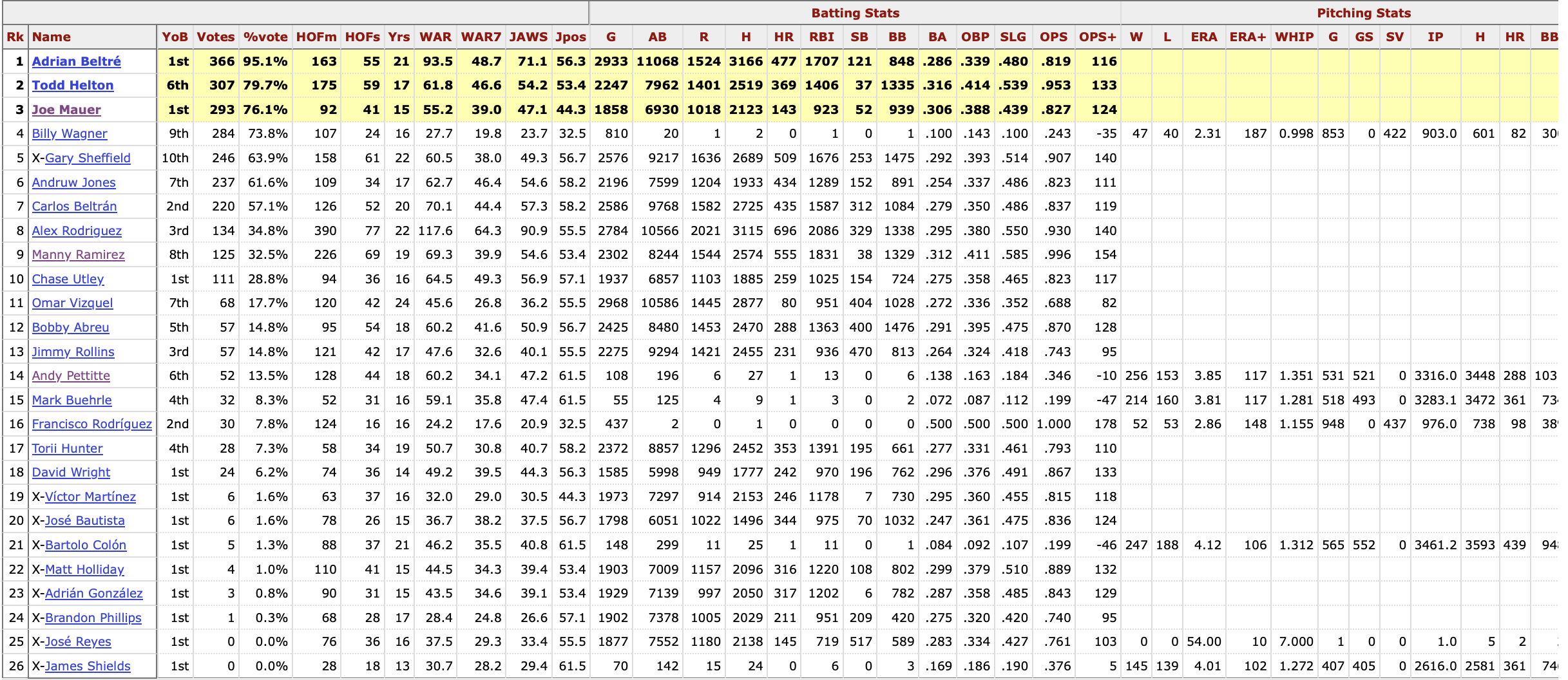 Features include 3 metrics on the player’s vote (year on ballot, number of votes, and vote%), a basic overview of their career stats, both pitching and hitting, and a handful of the previously discussed HOF metrics.