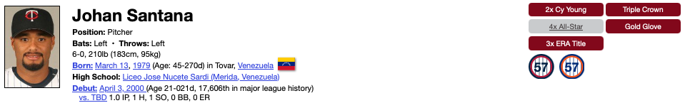 Finally, in addition to batting and pitching stats, the player pages also offer data on awards/accomplishments from the player’s career. This data can be seen below: